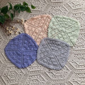 角に丸みがある四角形で、縁にはピコット編みの飾りを入れています。
