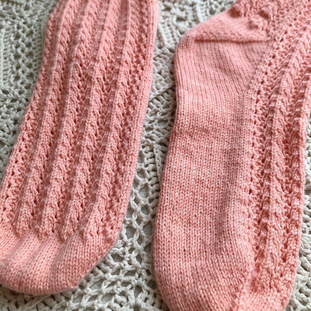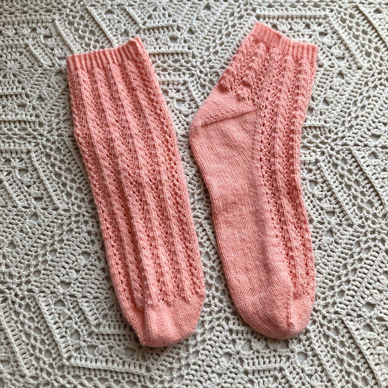 棒針編みで編む地模様と透かし編みが特徴の靴下の編み図になります。