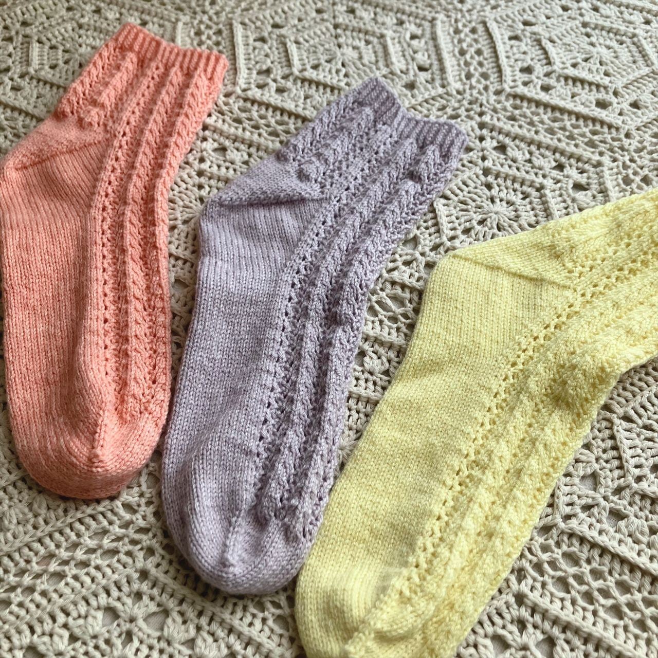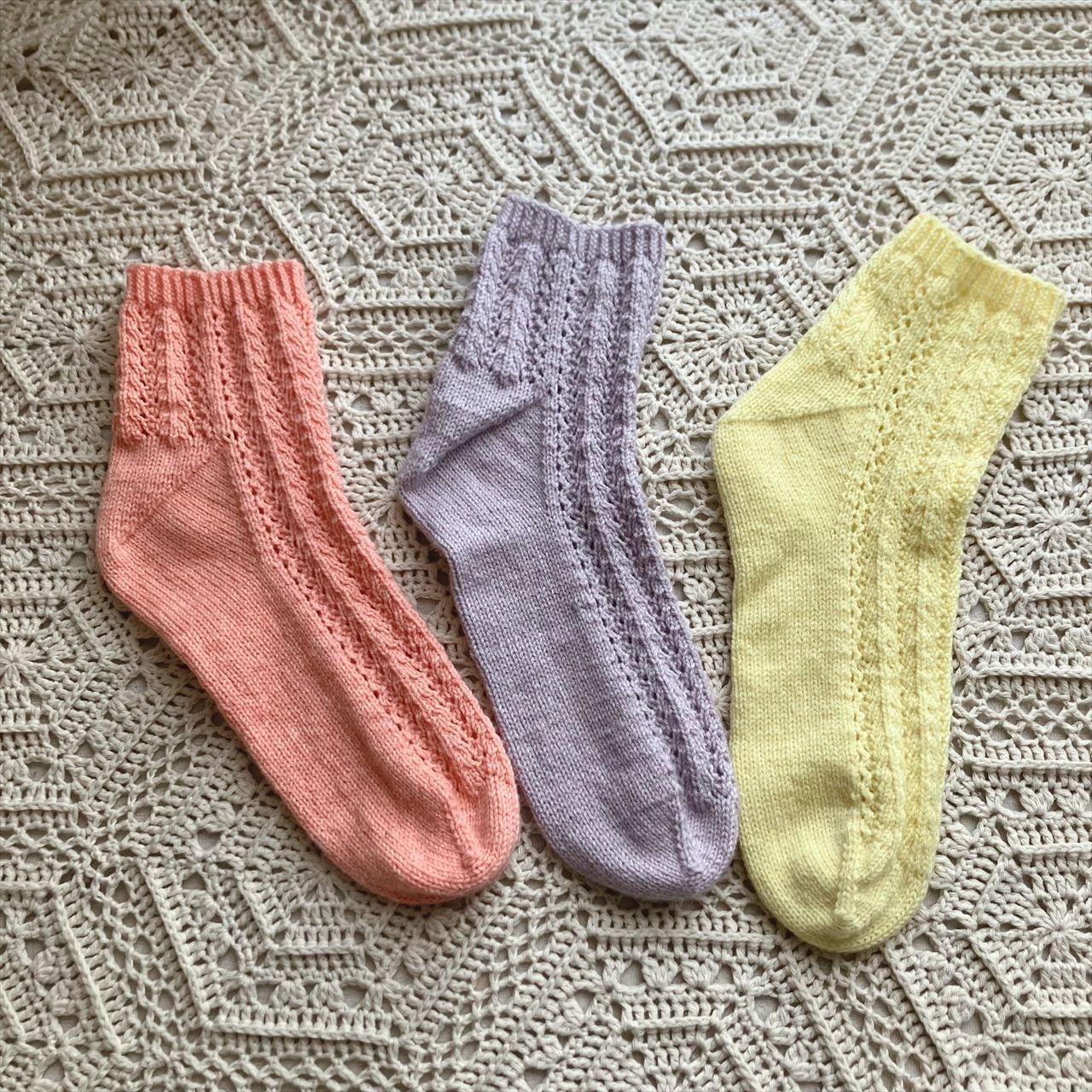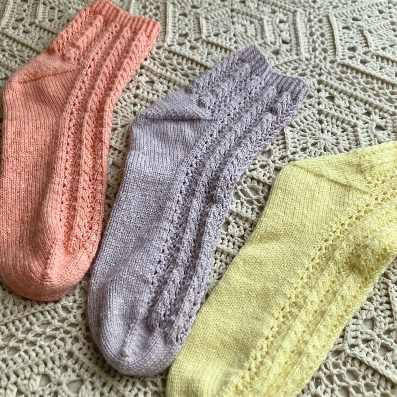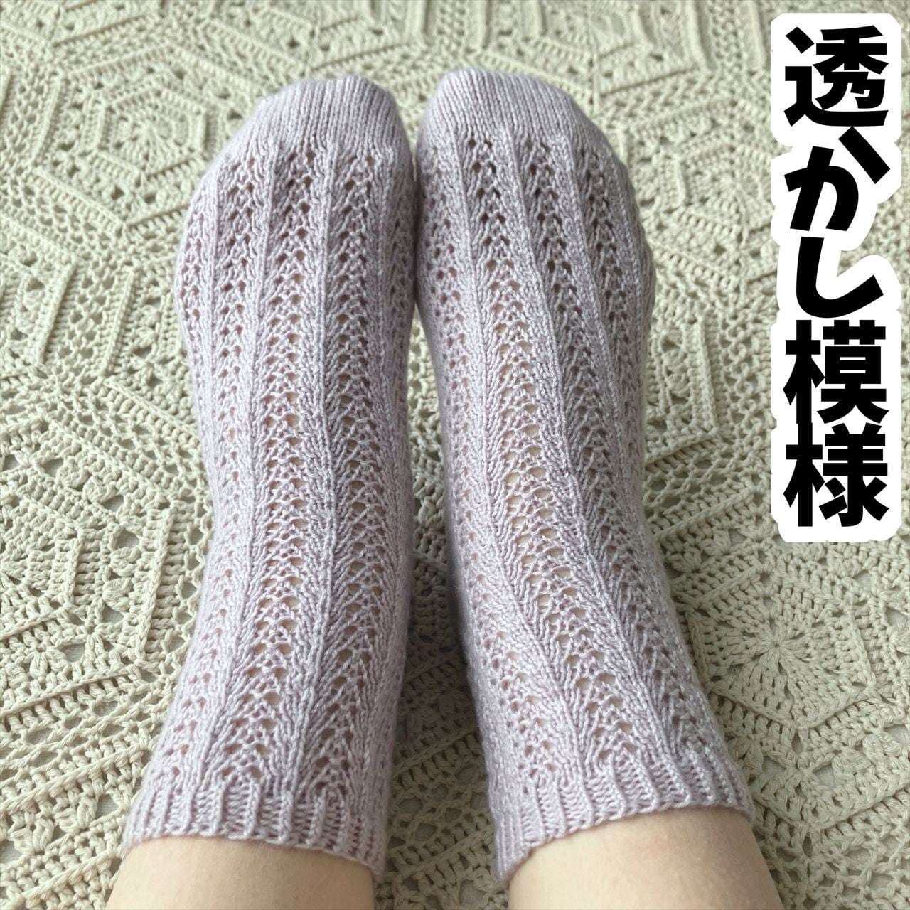 ソックヤーンで編んだ2種類の靴下がセットになっていて、これからの季節に涼しく履ける透かし模様タイプと、しっかりした編地の透かし少なめタイプになります。