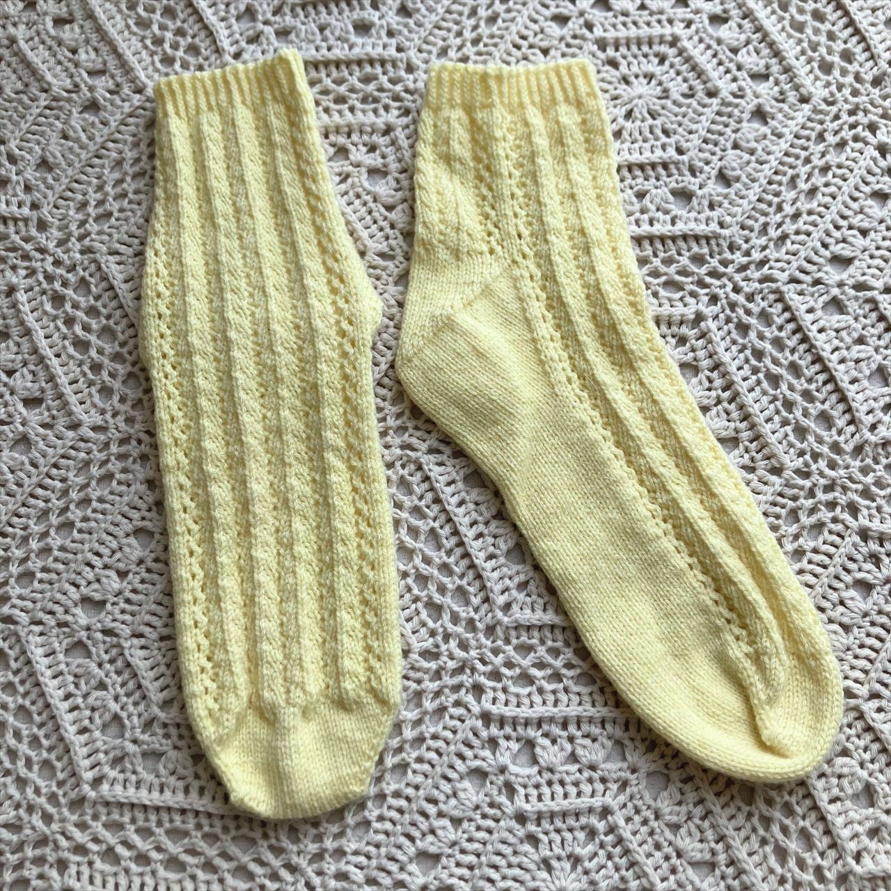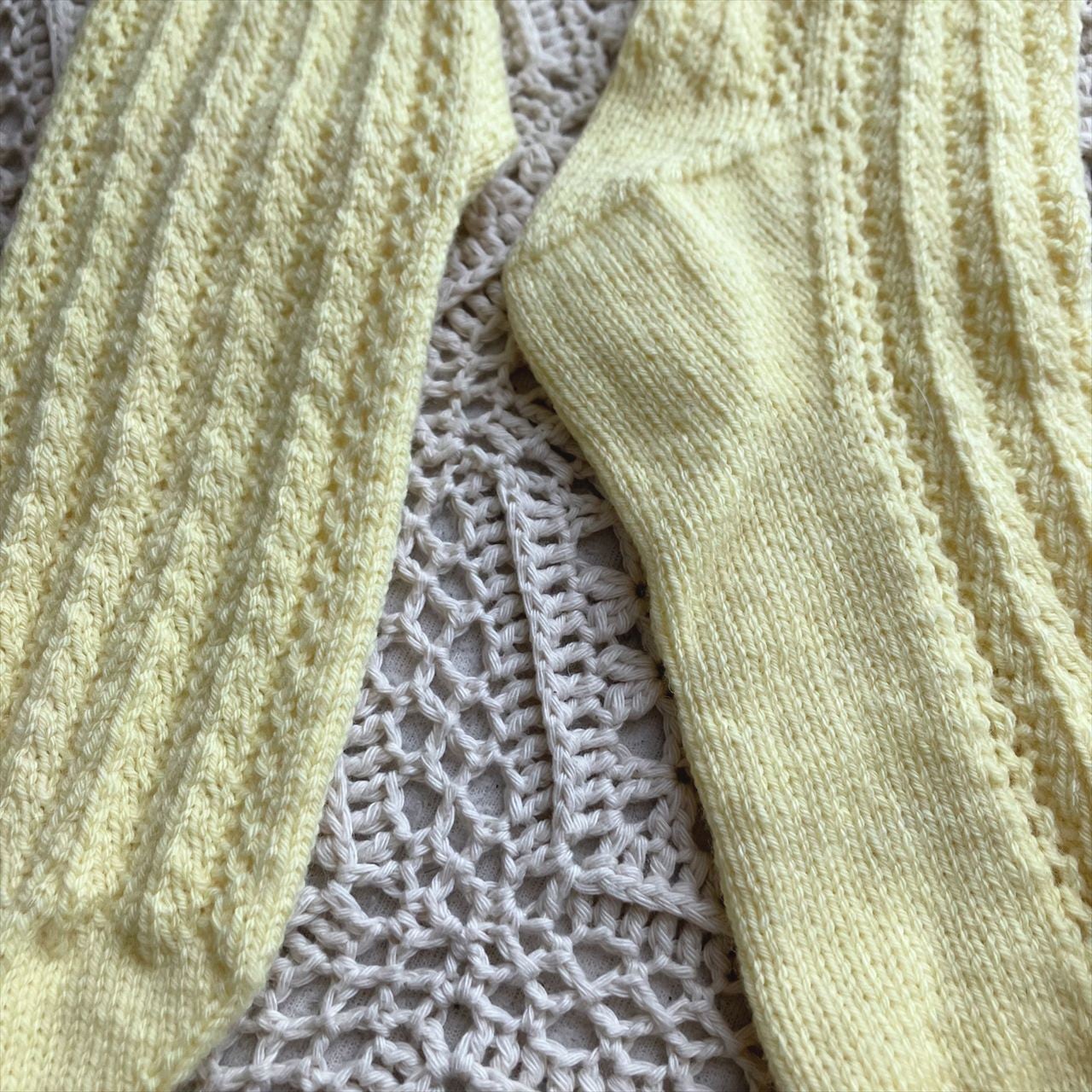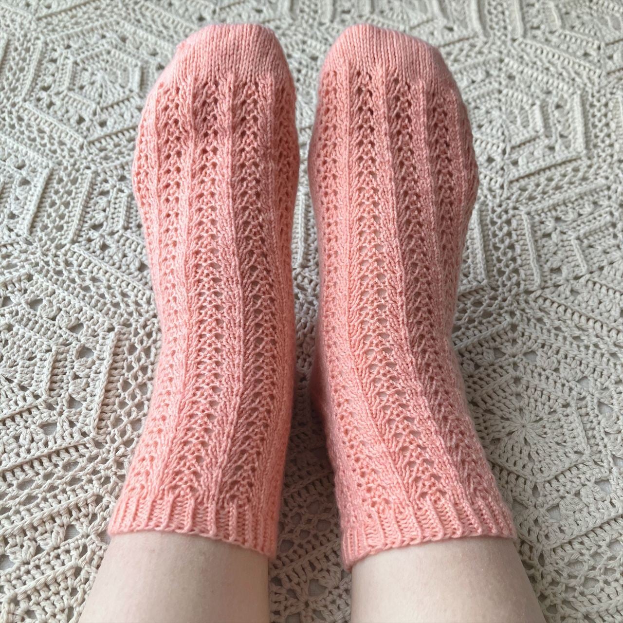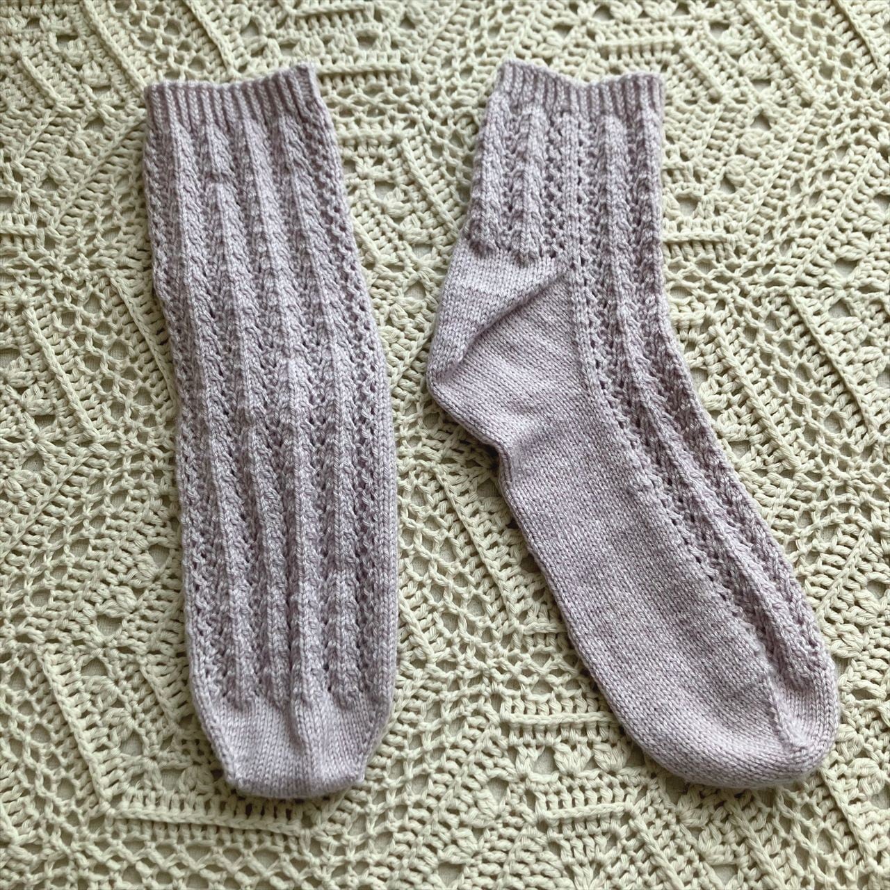 ソックヤーンで編んだ2種類の靴下がセットになっていて、これからの季節に涼しく履ける透かし模様タイプと、しっかりした編地の透かし少なめタイプになります。