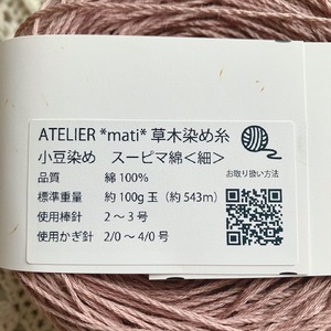 北海道産の小豆を使って染めた細めのスーピマコットン100%の手編み糸になります。