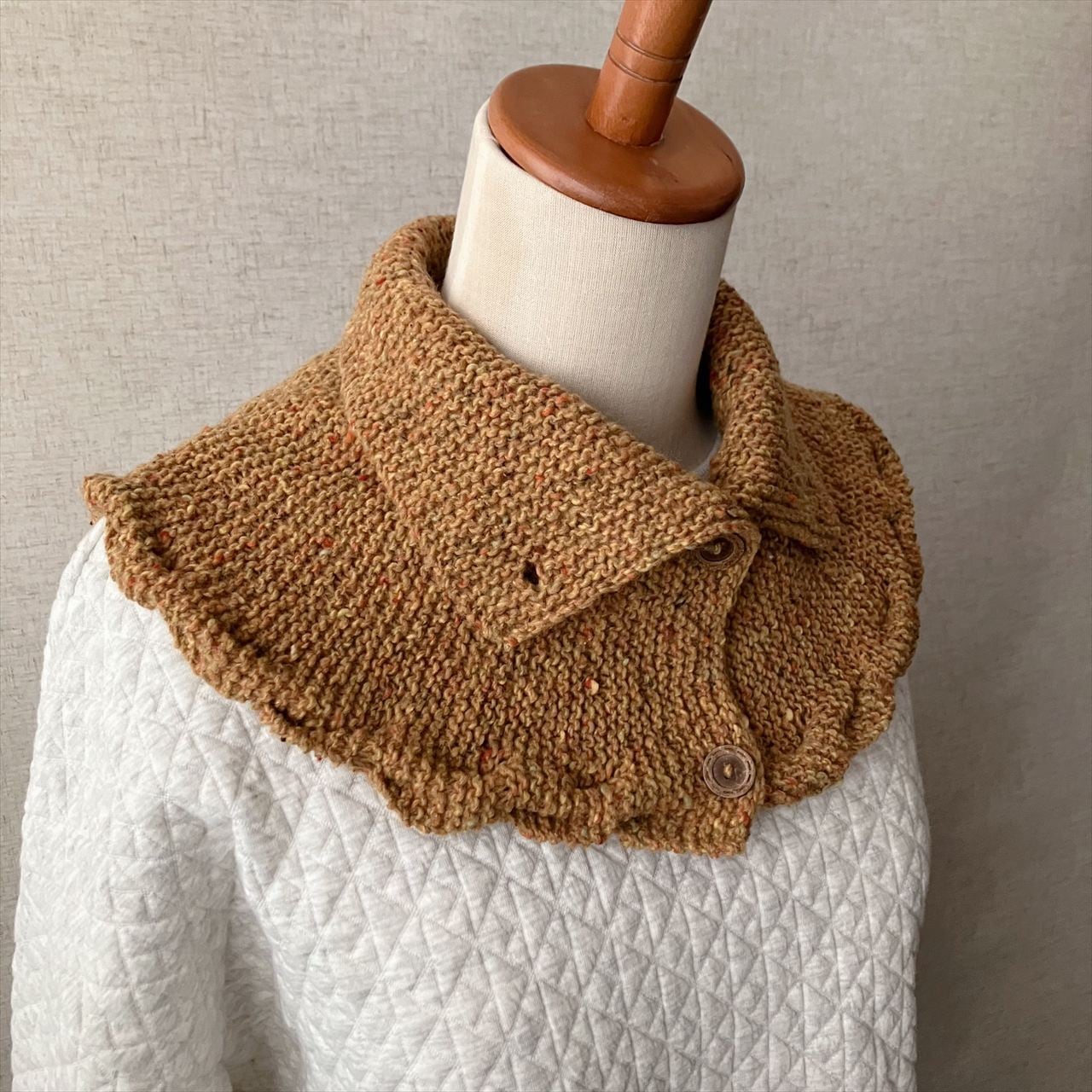 前開きで、首回りをすっぽりと包み込んだり、襟を折り返して付け襟風にしたりと、いろいろな着け方がお楽しみいただけます。