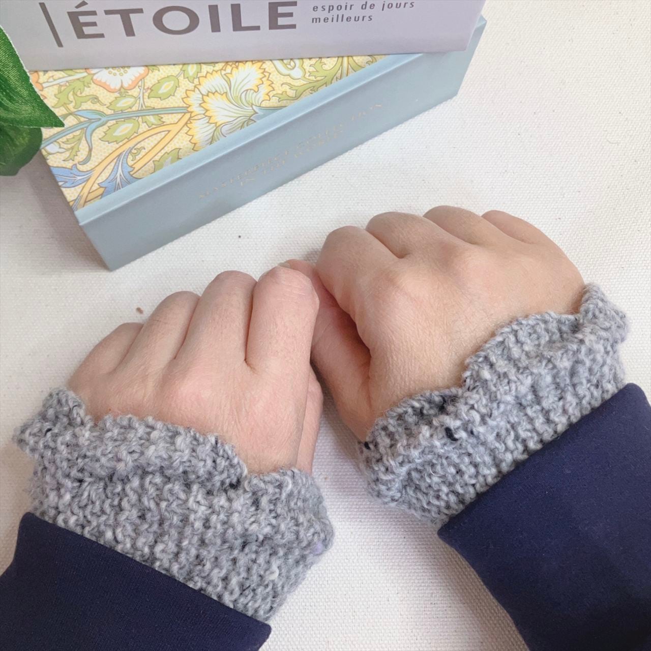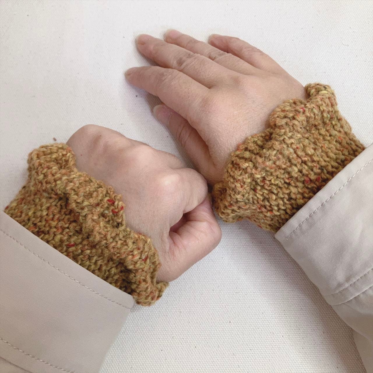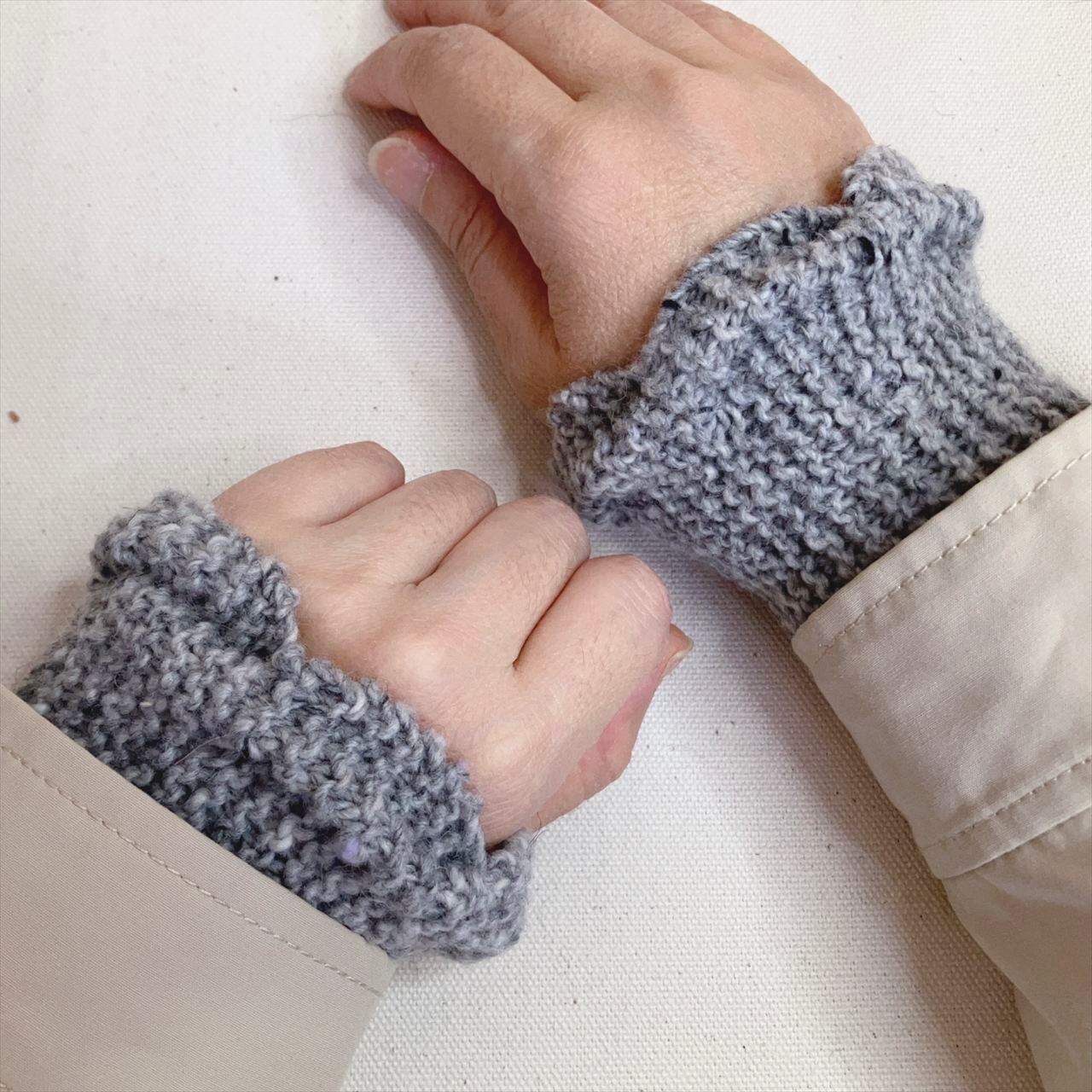 フリルのように見えるウネウネ模様が、コートやジャケットの袖口からちょこっとだけ見えて、とても可愛いリストウォーマ―になりました。