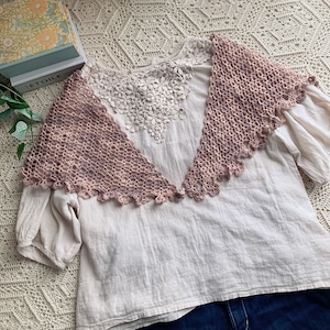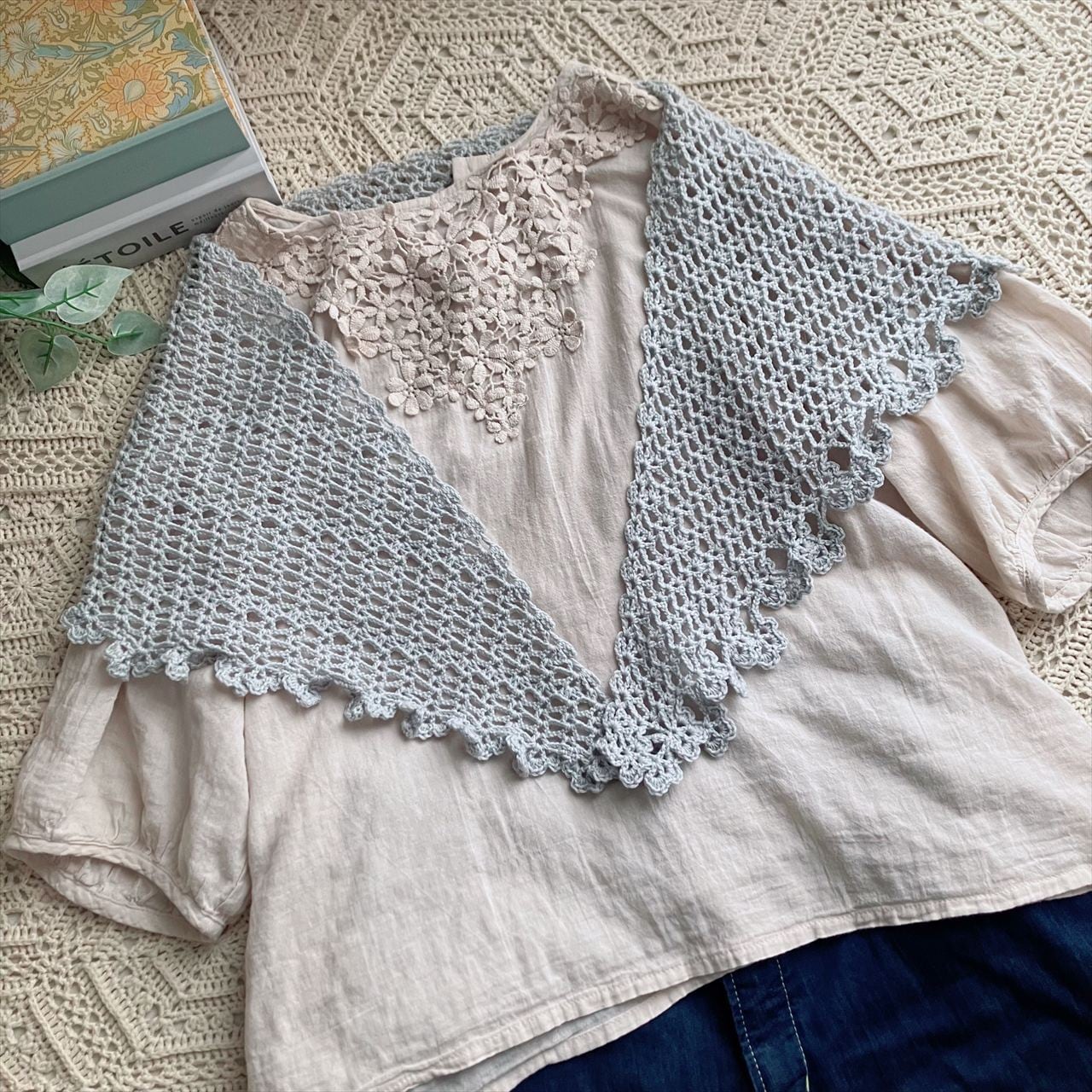 両端の先端が細くなった細長の形のストールで、三角ストールのようにふんわりと羽織っていただいたり、前を軽く結んで付け襟風のストールとして使ったり、首元にぐるぐる巻いてネックウォーマーのようにも使っていただけます。