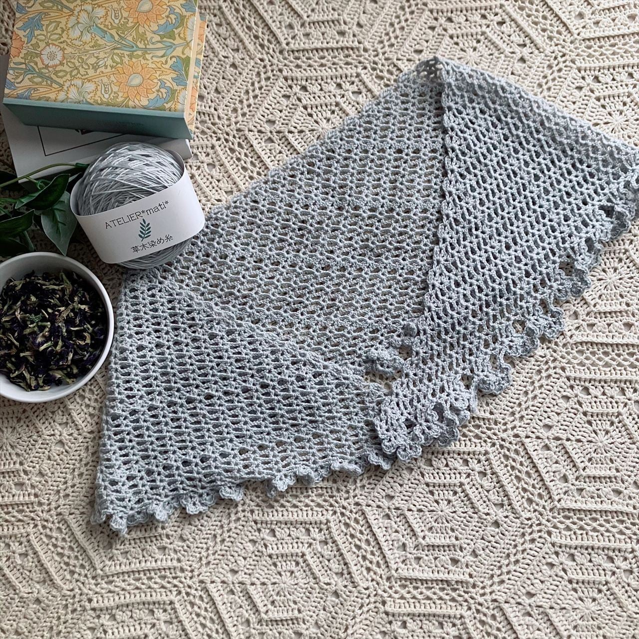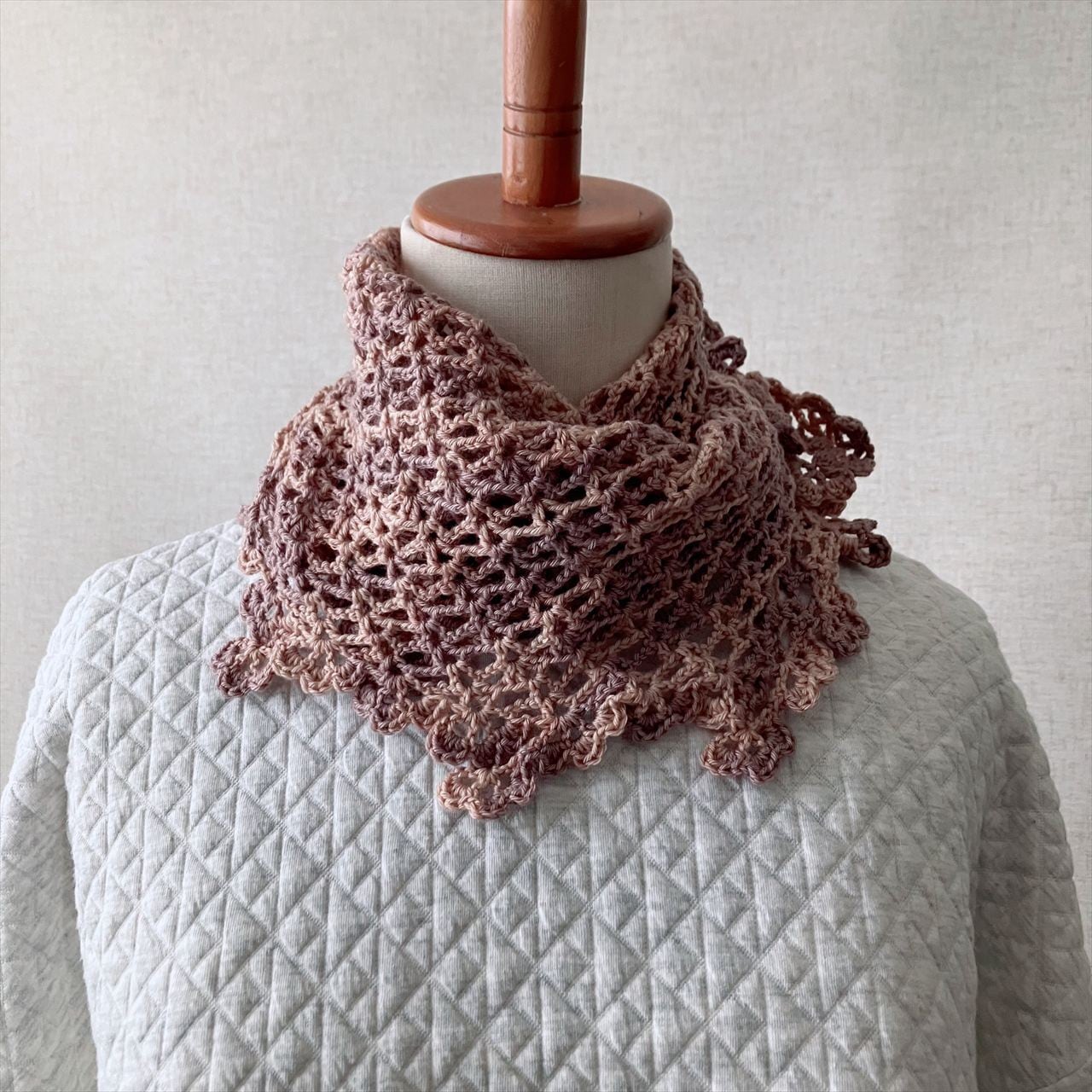 両端の先端が細くなった細長の形のストールで、三角ストールのようにふんわりと羽織っていただいたり、前を軽く結んで付け襟風のストールとして使ったり、首元にぐるぐる巻いてネックウォーマーのようにも使っていただけます。