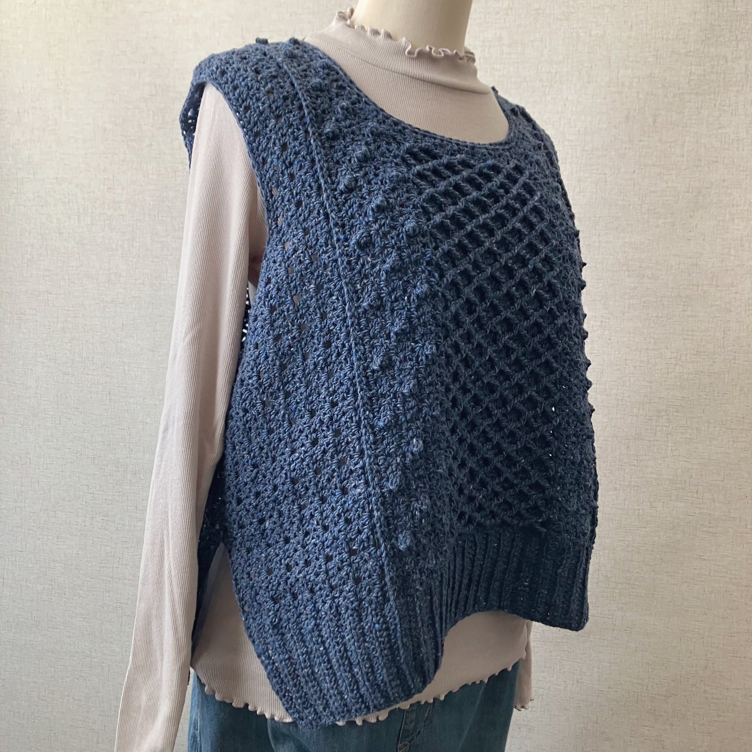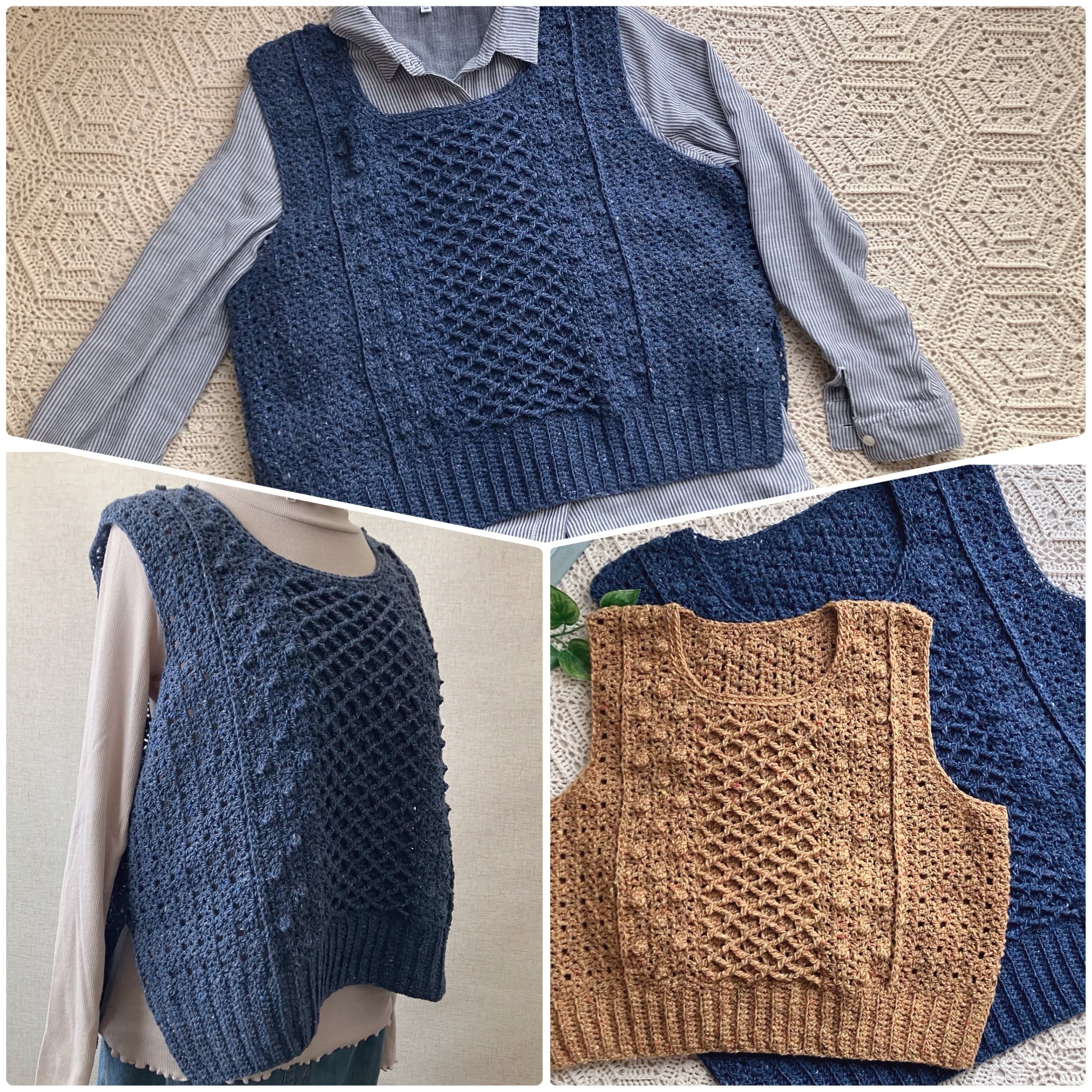シンプルな地模様と、玉編みが可愛いボッブル風の模様、棒針のハニカム模様みたいな小さなダイヤ柄の3種類の模様を使って、ざっくりとした風合いのベストになりました。