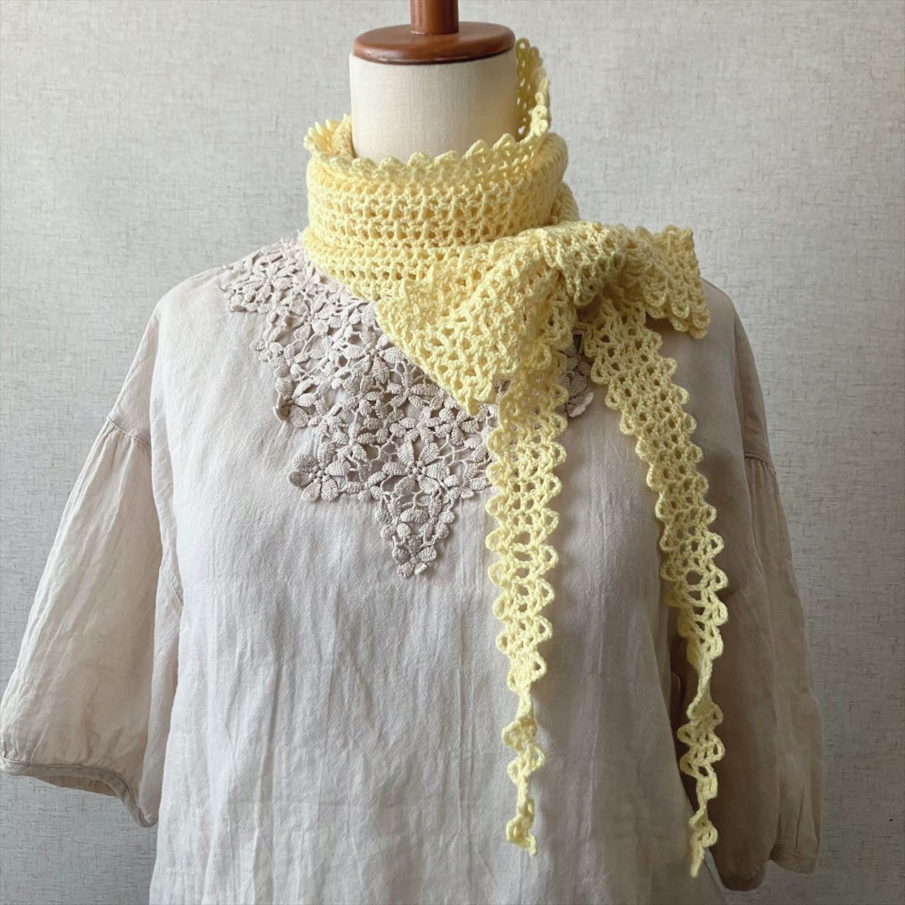 最近SNSでよく見かけるくるくる丸めるとクロワッサンのようになるストールが編みたくて、春先まで使えるような感じで編んでみました。