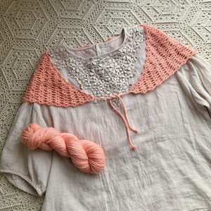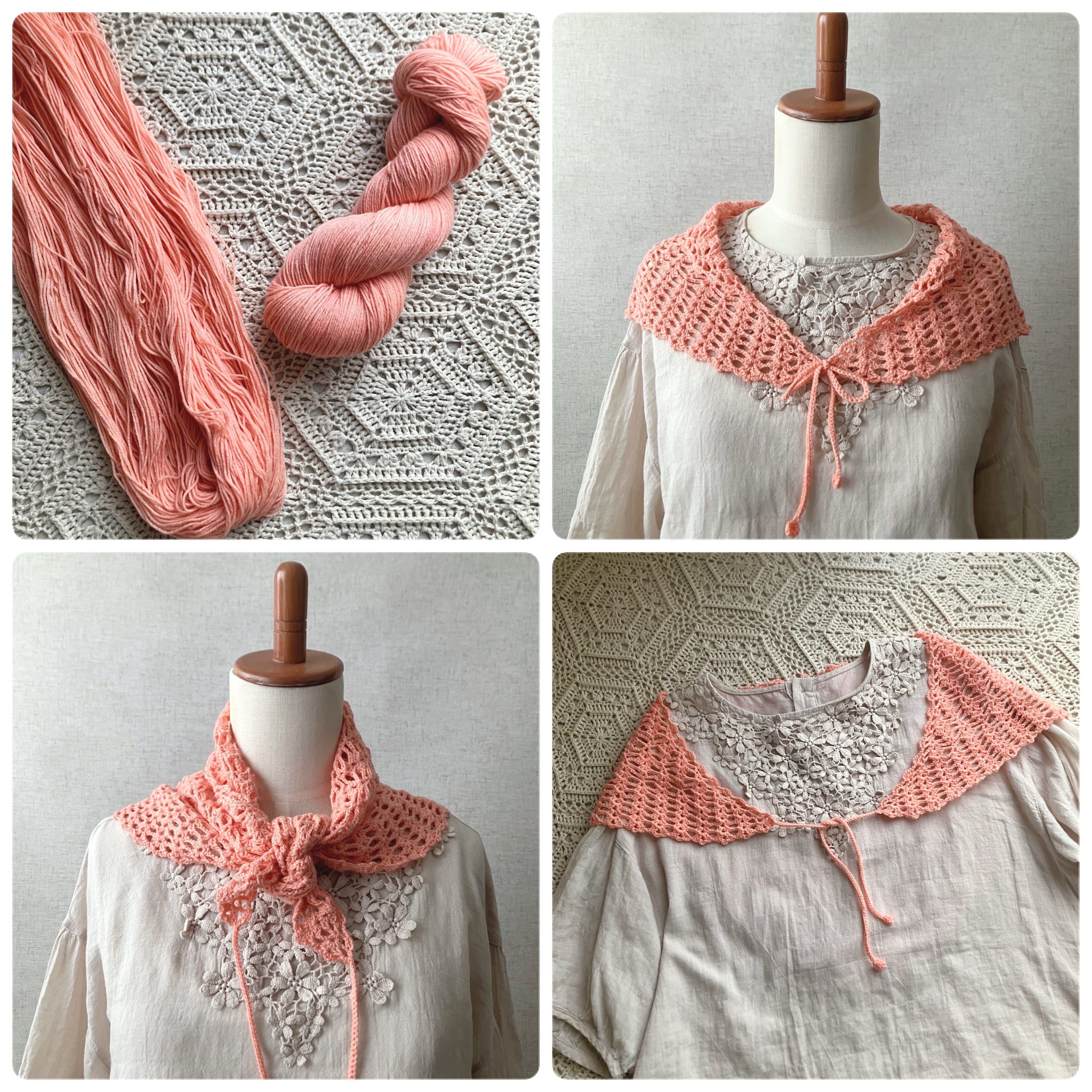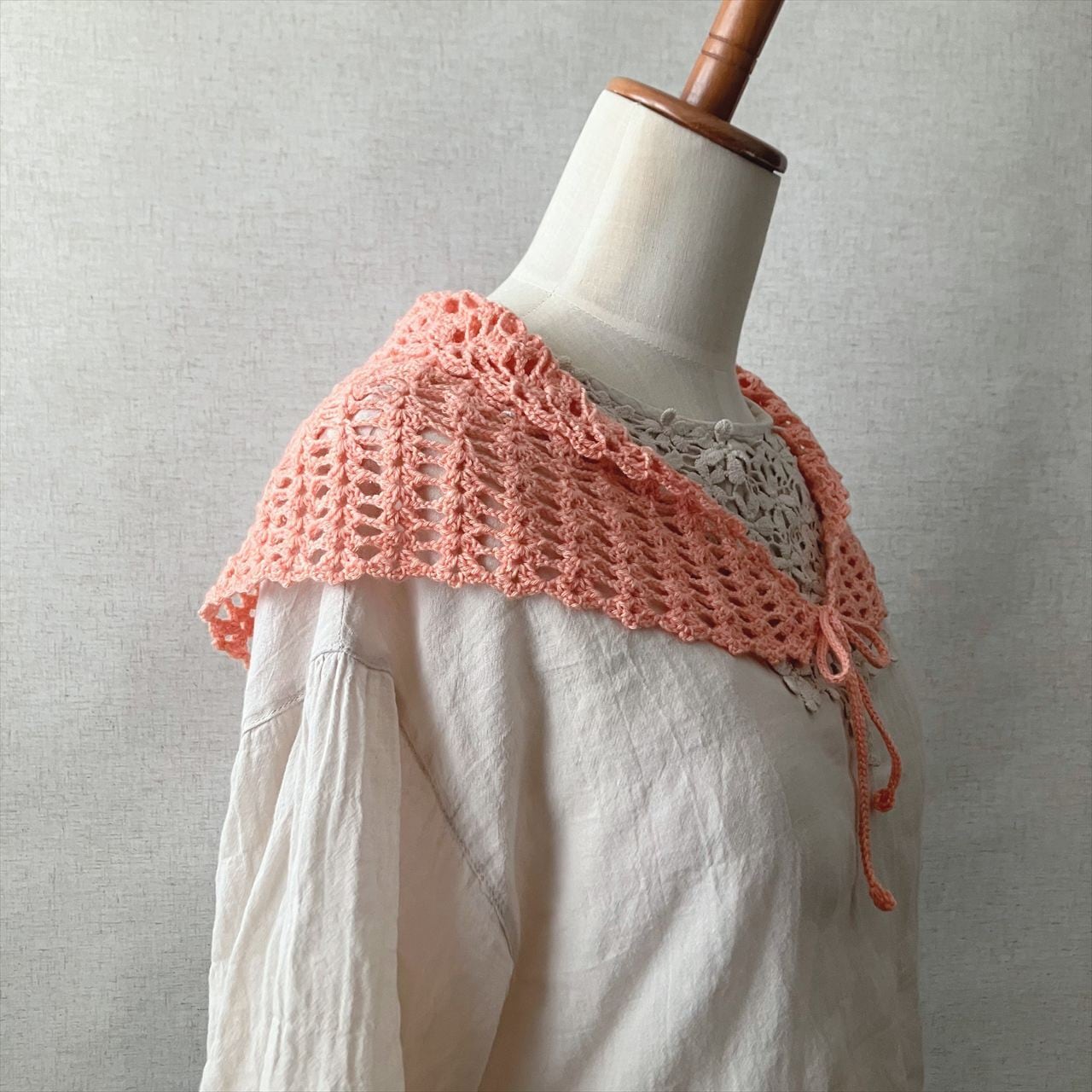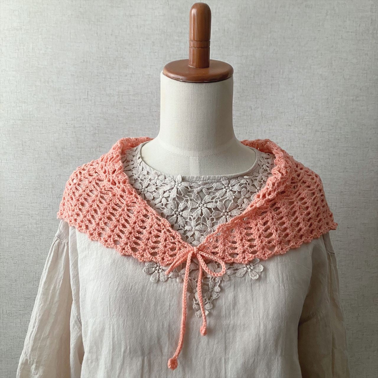 ふんわり羽織って紐を結べば付け襟風、前で軽く結んでバンダナスカーフ風、くるっと首に巻いて火を結べたネックウォーマー風…と小さいながらもコーディネートをお楽しみいただけます。