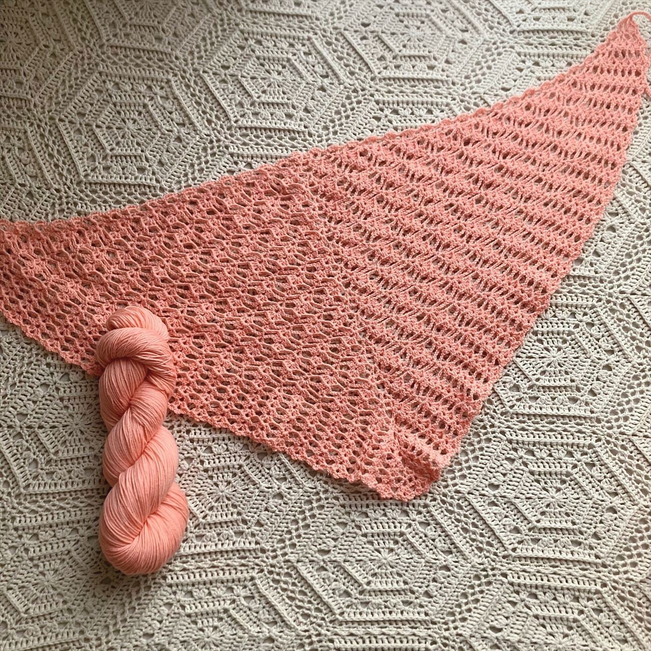 全体を長編みベースの模様編みで編むシンプルな三角ストールですが、シンプルながら可愛らしいストールが出来上がりました。