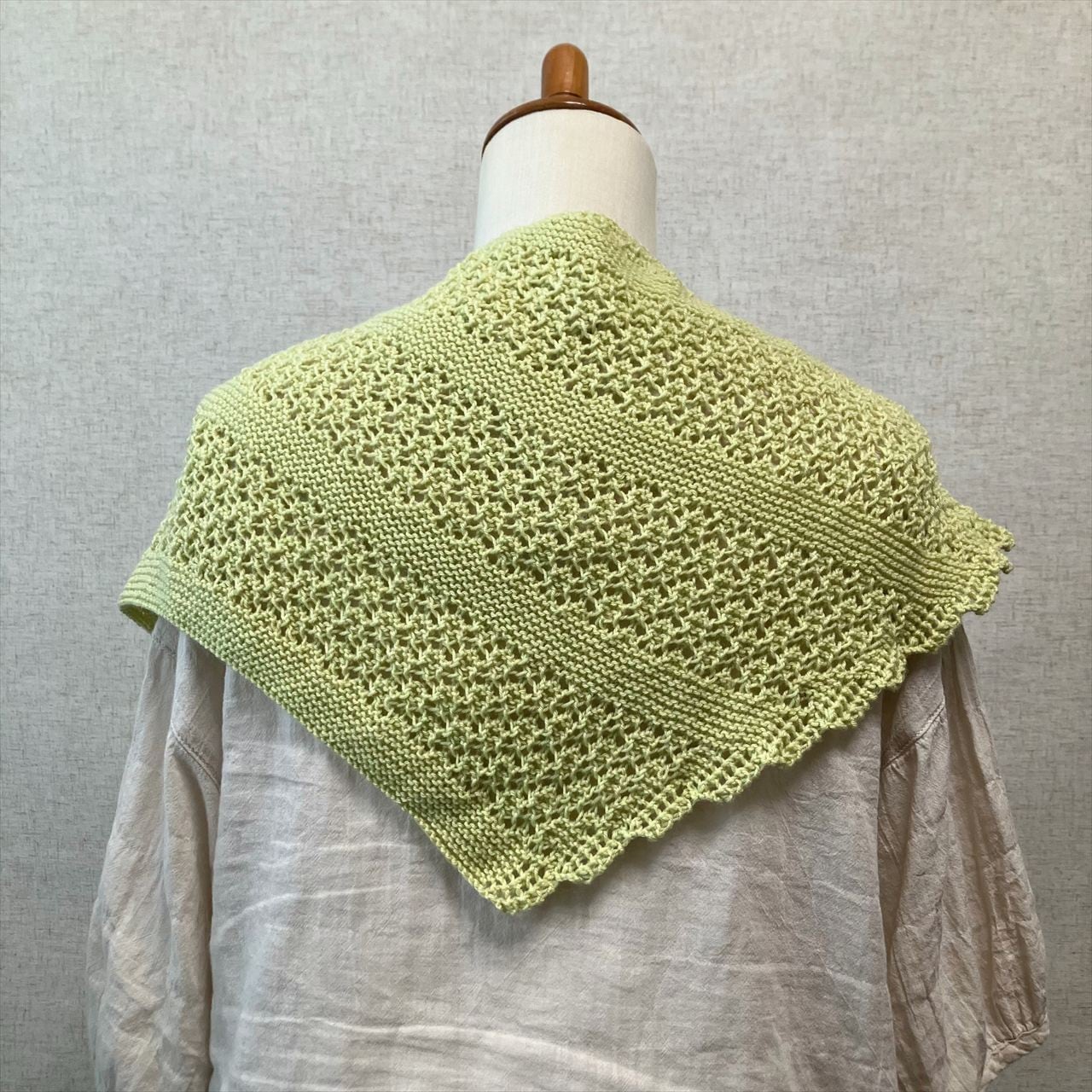 ガーター編みの中に透かし柄を入れて、ガーター模様と透かし模様のボーダーが斜めになったデザインになります。